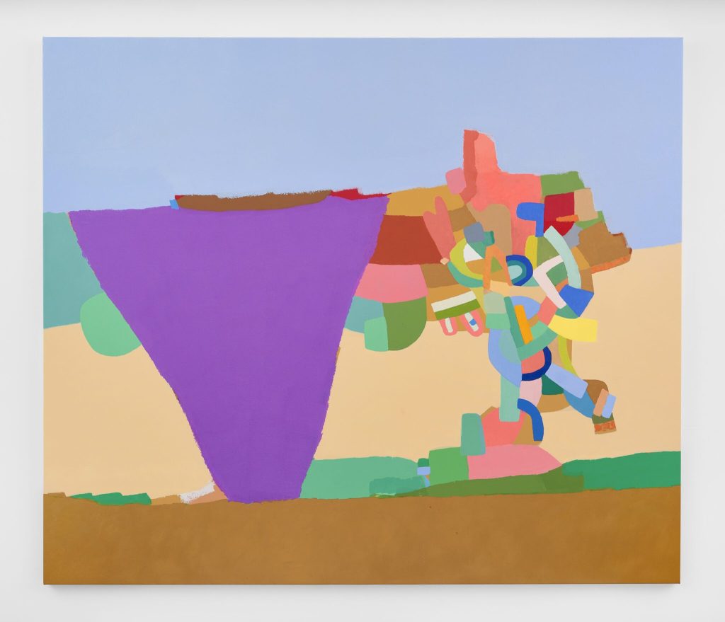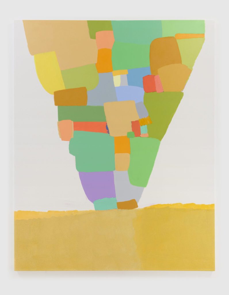 Vivid colors merge together to mirror overgrown terrains, while muted hues evoke sun-weathered buildings, as lines blur together to suggest a landscape view from above or the silhouette of a figure in motion. Triangles—both right-side up and upside down—conjure images of volcanoes or mountains. Shapes fall into each other to form precarious yet balanced compositions, reflecting an ever-changing topography, while newer paintings like Lost at Sea (2023) verge on the figurative, resembling a ferry crossing an expanse of ocean.