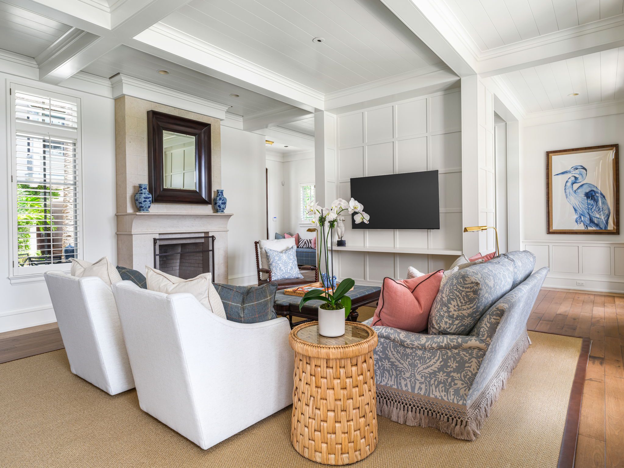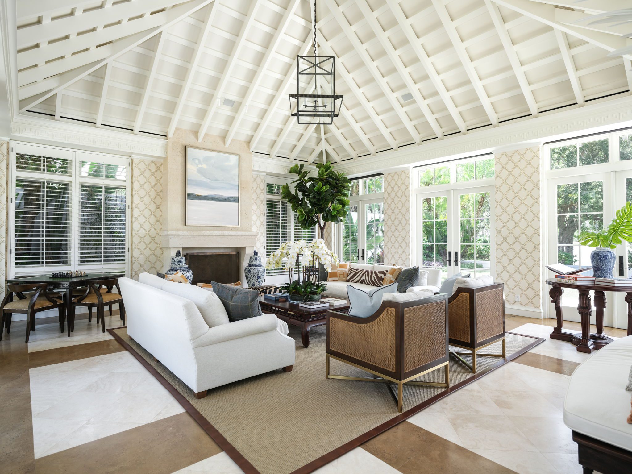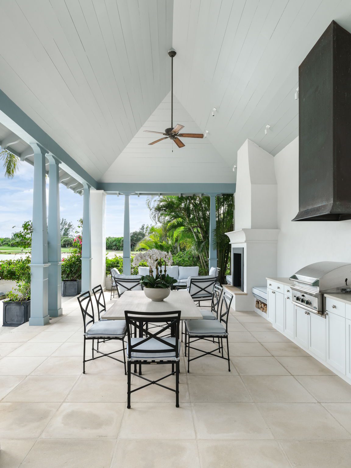 The primary suite, which occupies its own wing overlooking the lake and golf course, features a bedroom with vaulted nickel-jointed ceilings, a study with custom built-in shelving and desk, and a full-width covered balcony. The primary bath is finished with travertine stone and white statuary marble. The guest wing offers three additional bedrooms, all with en-suite baths, a sitting room, and two shared balconies. A separate guest house offers a primary-scale bedroom and en-suite bath as well as a kitchenette that opens to a balcony overlooking the South Village lily pond.