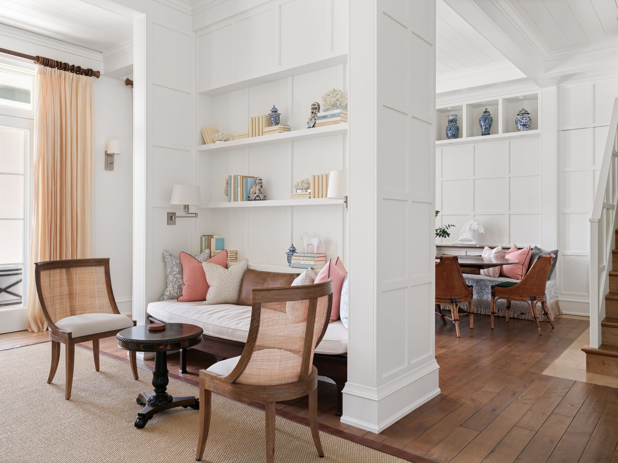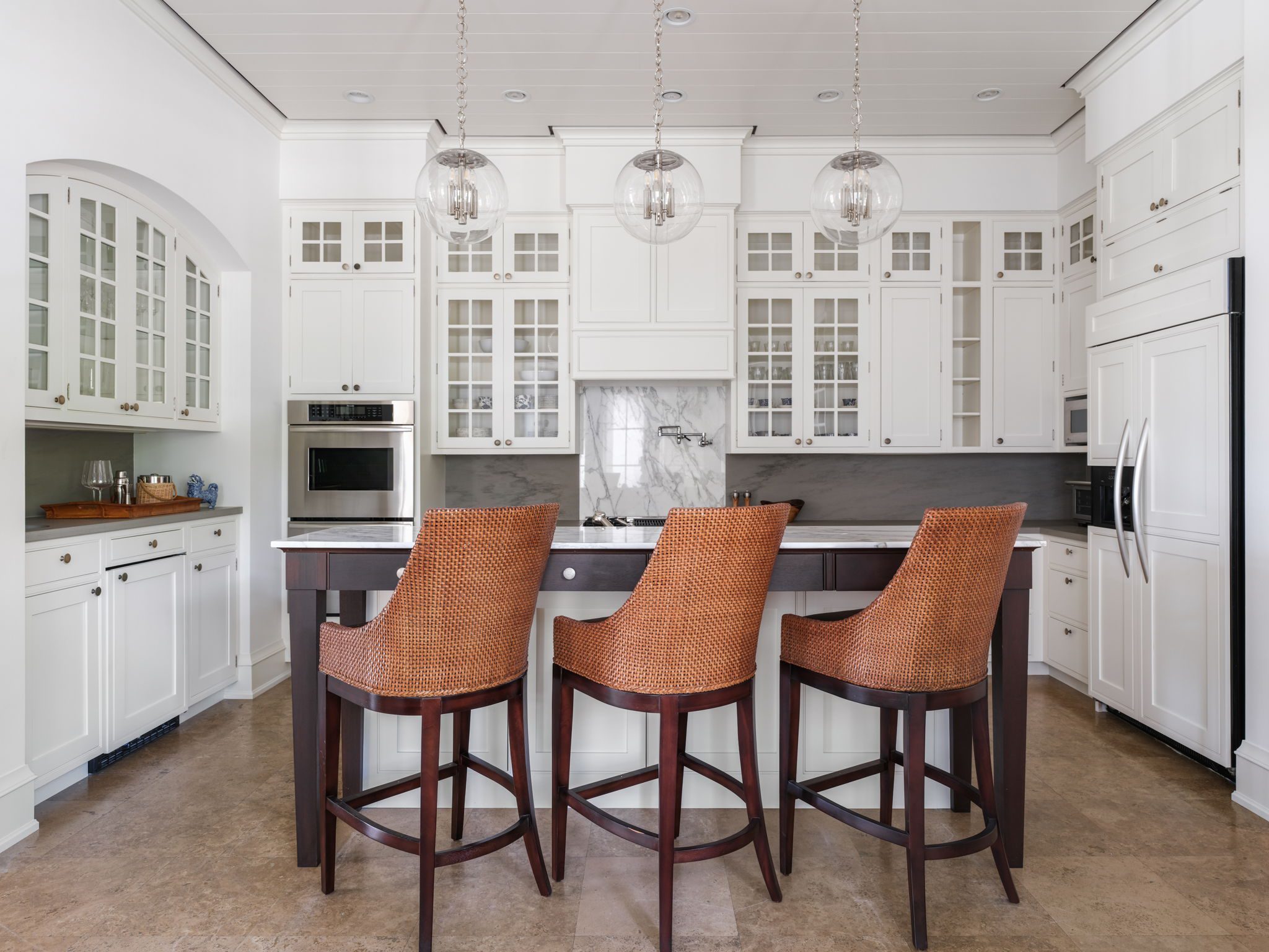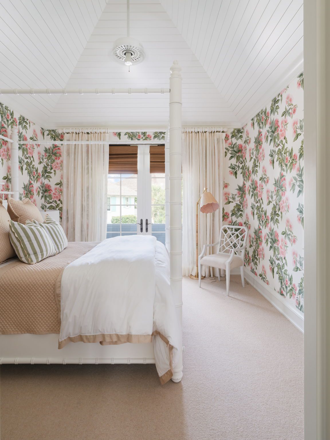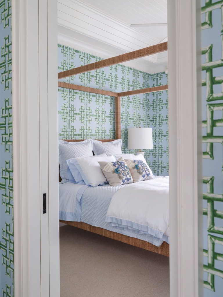 The primary suite, which occupies its own wing overlooking the lake and golf course, features a bedroom with vaulted nickel-jointed ceilings, a study with custom built-in shelving and desk, and a full-width covered balcony. The primary bath is finished with travertine stone and white statuary marble. The guest wing offers three additional bedrooms, all with en-suite baths, a sitting room, and two shared balconies. A separate guest house offers a primary-scale bedroom and en-suite bath as well as a kitchenette that opens to a balcony overlooking the South Village lily pond.