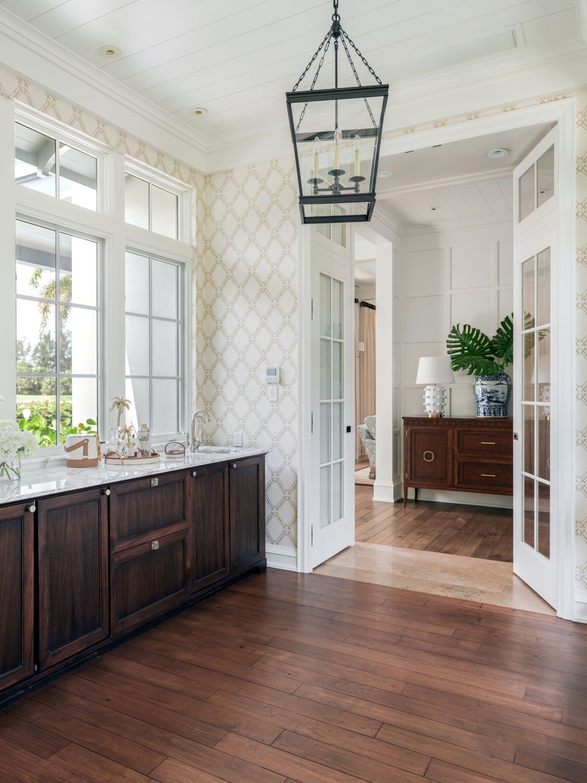 With sweeping southwest views over the golf course, a lakefront pool terrace and a spacious central courtyard with a reflecting pool, this extensively customized South Village home celebrates seamless indoor-outdoor living.