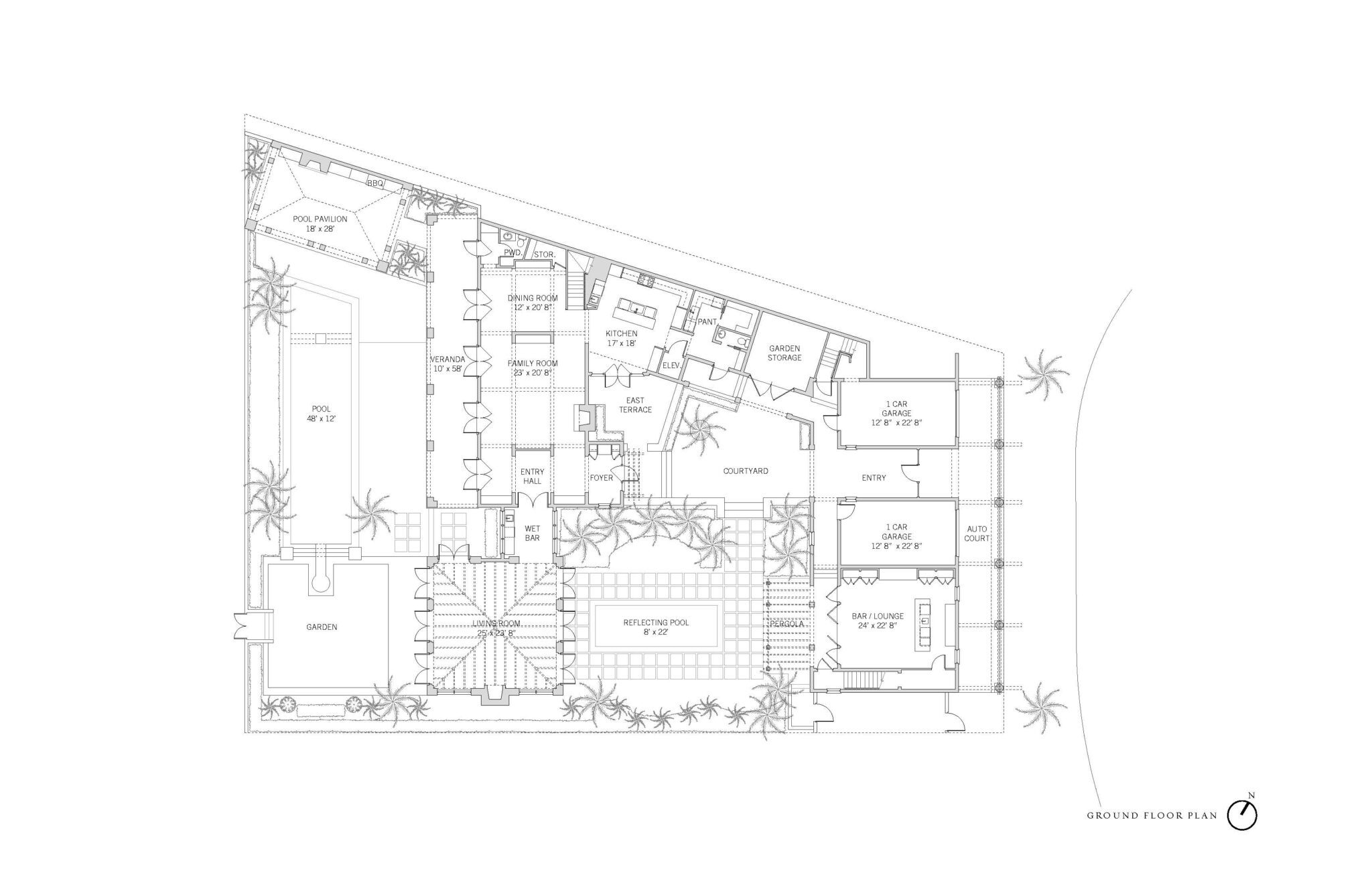 This home showcases sweeping southwest views and offers seamless indoor-outdoor living from virtually every room. Its pavilion-style living room, welcoming family room, and spacious casual dining room, all overlooking the lake and golf course, open through French doors to the lakefront pool terrace. A handsomely finished bar/lounge with 432-wine bottle storage capacity flows out to the reflecting pool garden through folding glass paneled doors. A living loggia adjacent to the terrace features an outdoor fireplace and a barbecue grill. The gourmet kitchen has a sitting nook and opens through French doors to a breakfast garden terrace in the central courtyard.