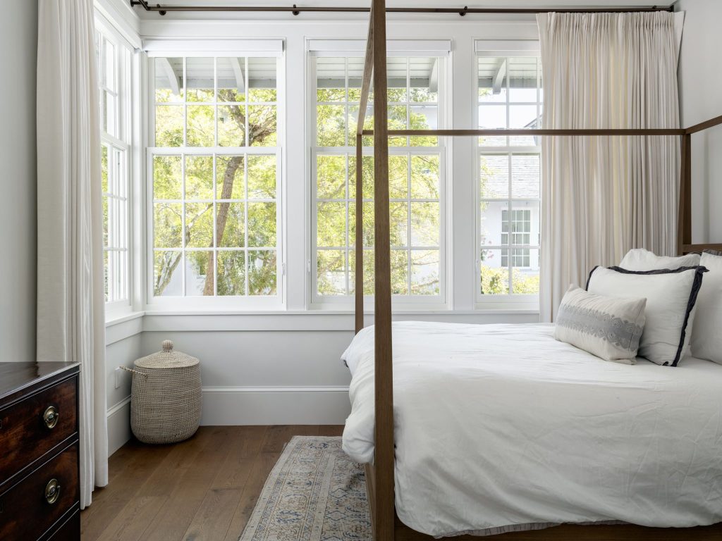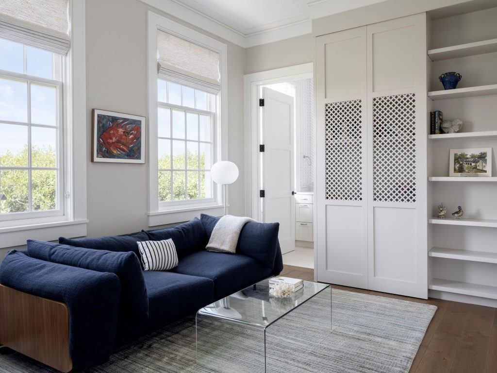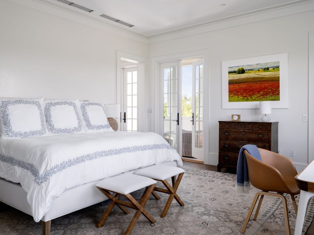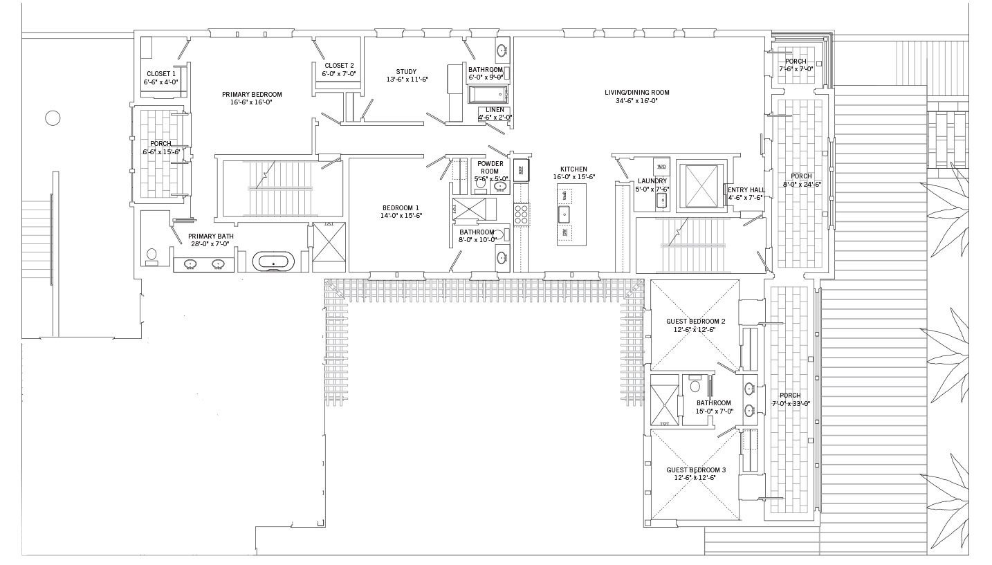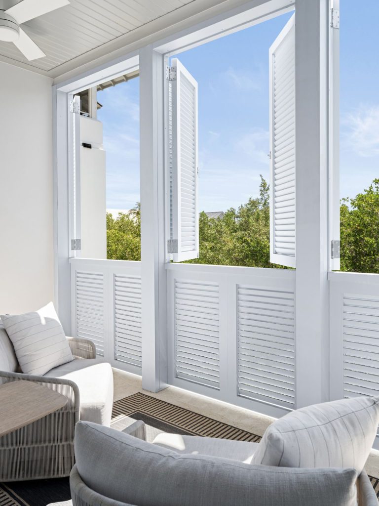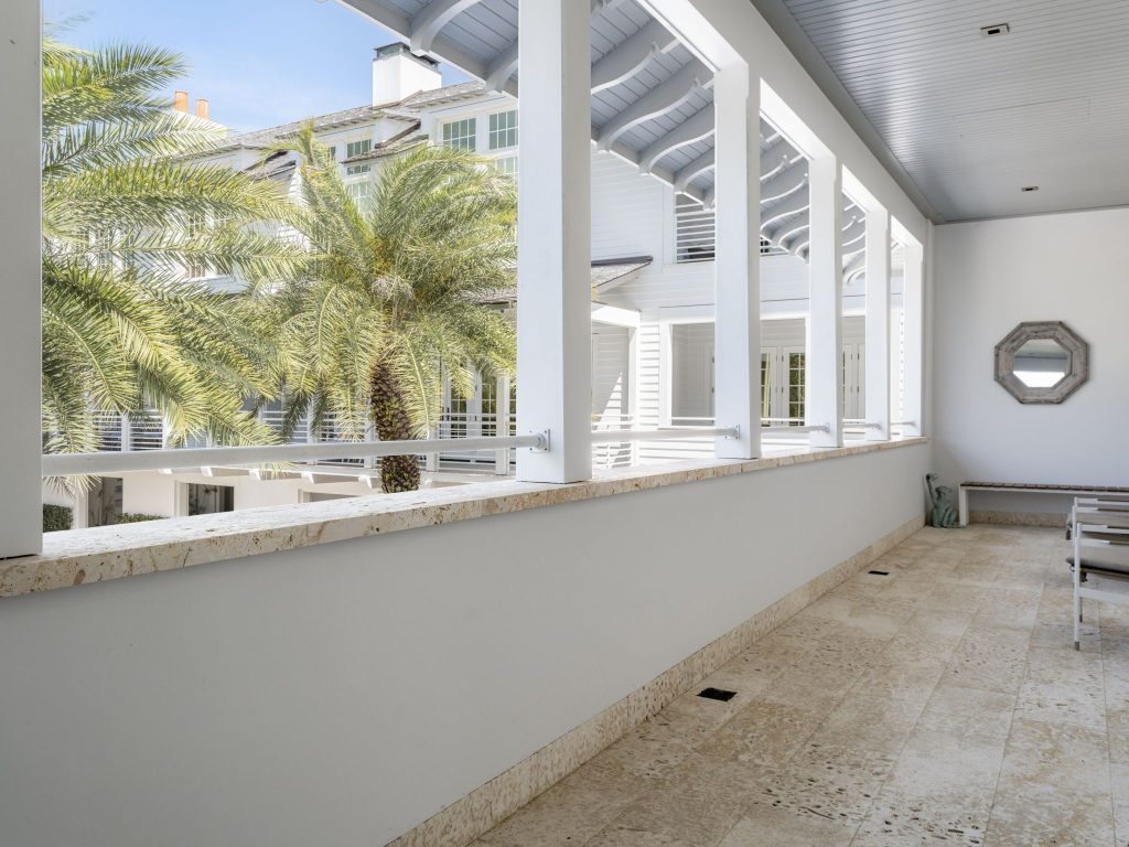 The elegant primary suite in this residence features a private south-facing porch accessed via French doors and appointed with shutters for privacy and light control. This suite has been thoughtfully designed to offer a spa-inspired bathroom and two walk-in closets with custom shelving. The main residence offers two guest suites, each with en-suite bathroom and one with custom built-in media cabinetry. The unique layout of this residence provides two additional guest suites that are each accessed via outside entrances on a private covered porch. These suites feature vaulted ceilings and share a Jack-and-Jill bathroom.