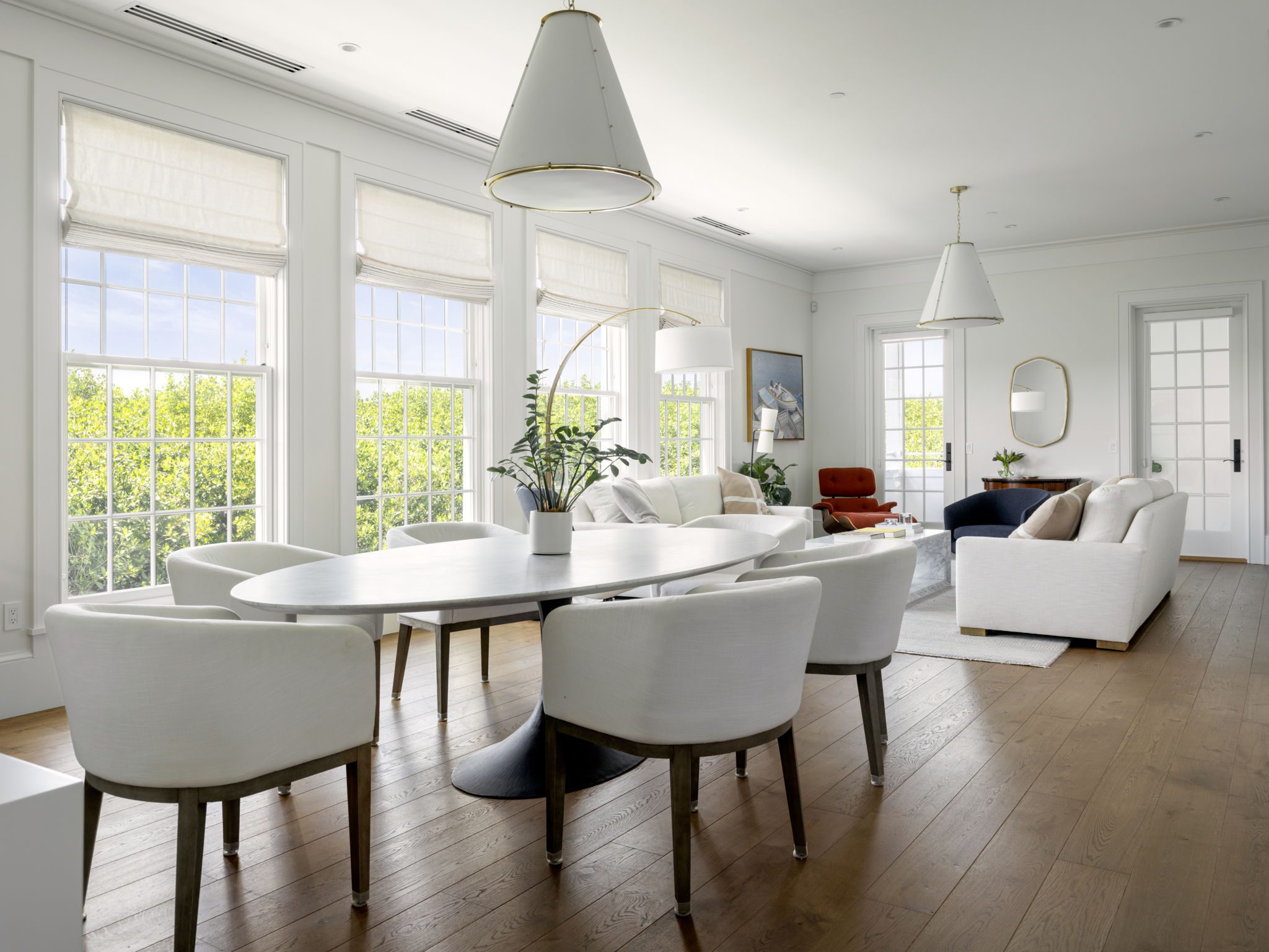 This expansive five-bedroom residence located on the second floor of Windsor Park Residences features three exposures with sunset views sweeping across the lush conservation area. Custom cabinetry and Calacatta Gold marble countertops bring sophisticated touches to the kitchen and bathrooms. Elegantly crafted interiors are finished with refined details including decorative millwork, custom cabinetry, and 7’-wide oak flooring throughout all living areas. Covered porches off the great room, primary bedroom, and two of the guest suites allow for seamless indoor-outdoor living.