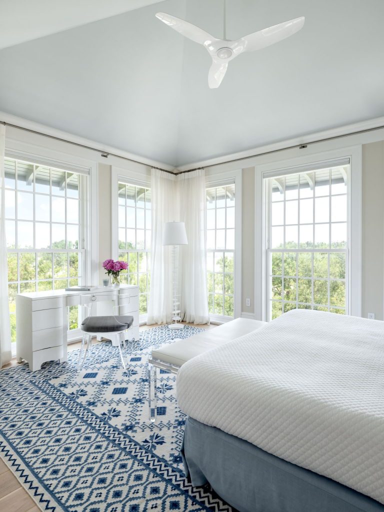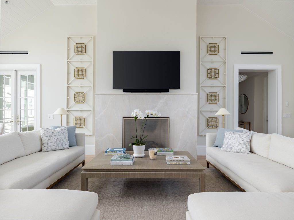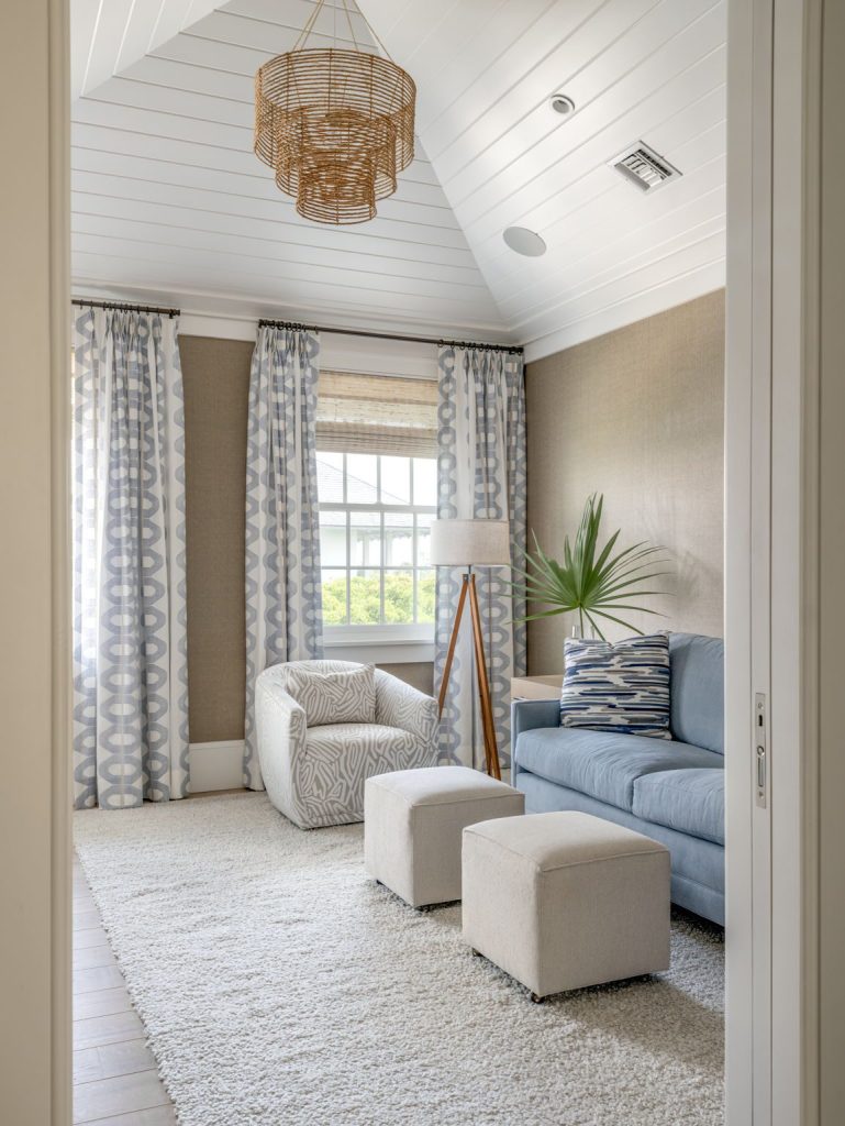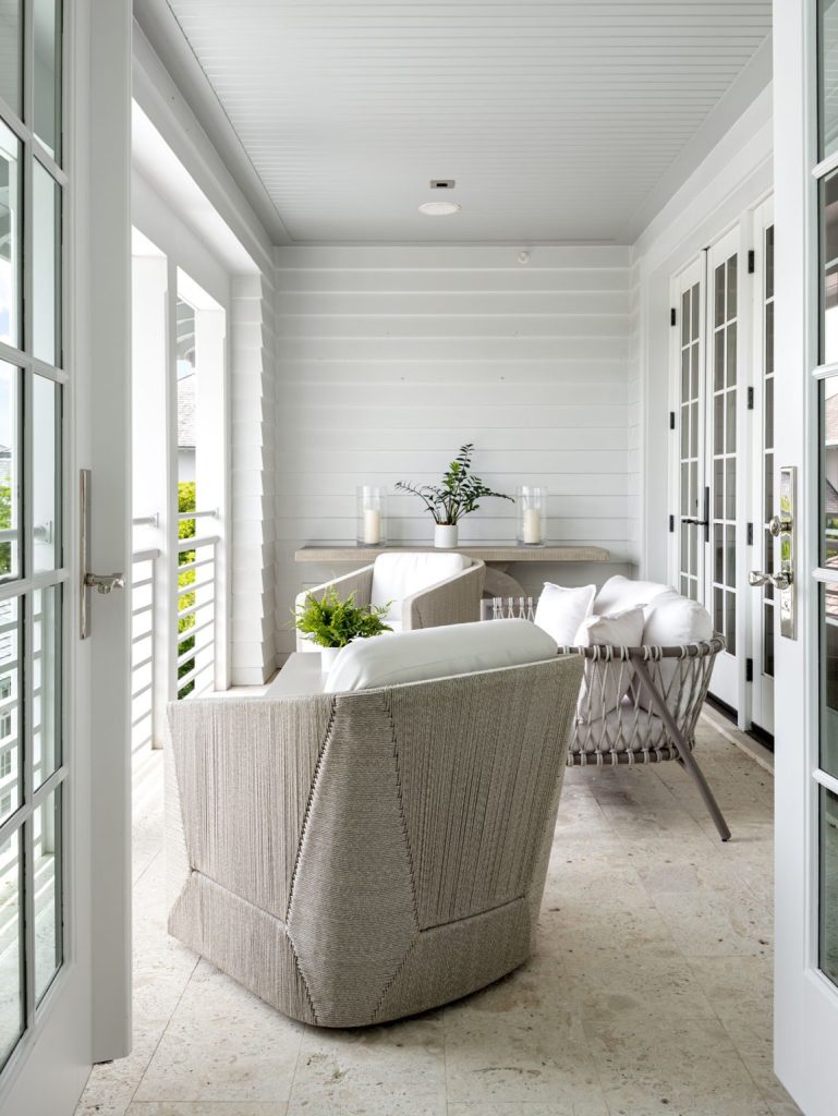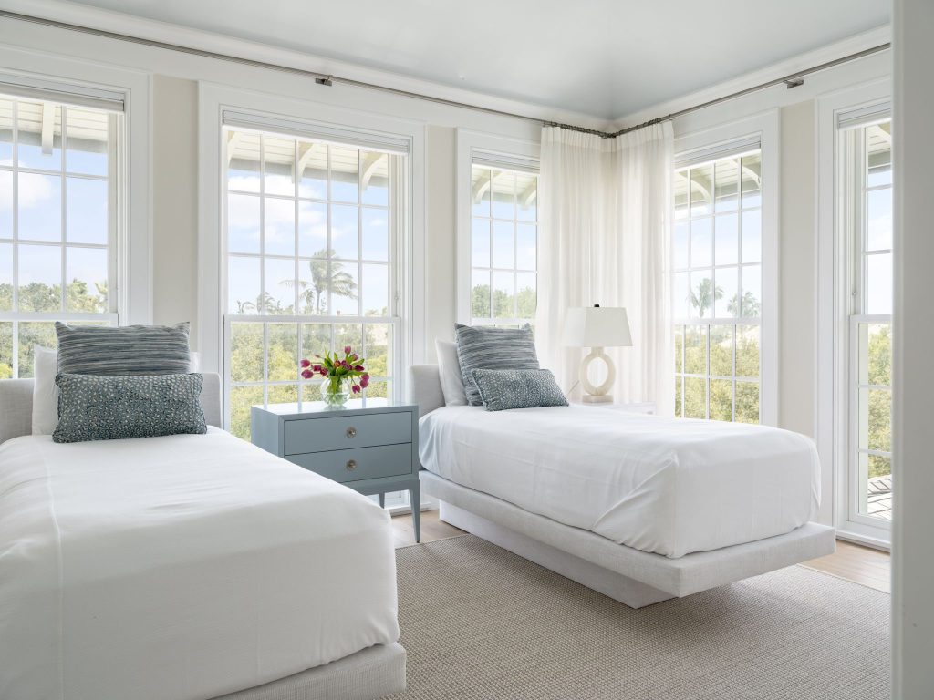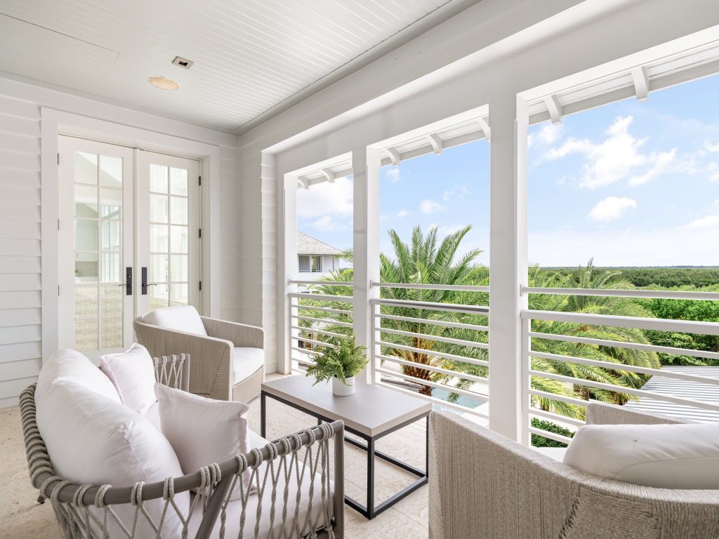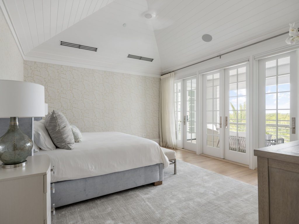 With three sets of French doors opening to the covered porch, soaring vaulted tongue-and-groove ceilings and a spacious en-suite bathroom clad in marble and limestone, the primary suite is a wonderfully relaxing retreat. Two walk-in closets provide ample storage space. The north and south guest suites both overlook beautifully landscaped greenspace and feature vaulted ceilings, custom closets and floor-to-ceiling windows.