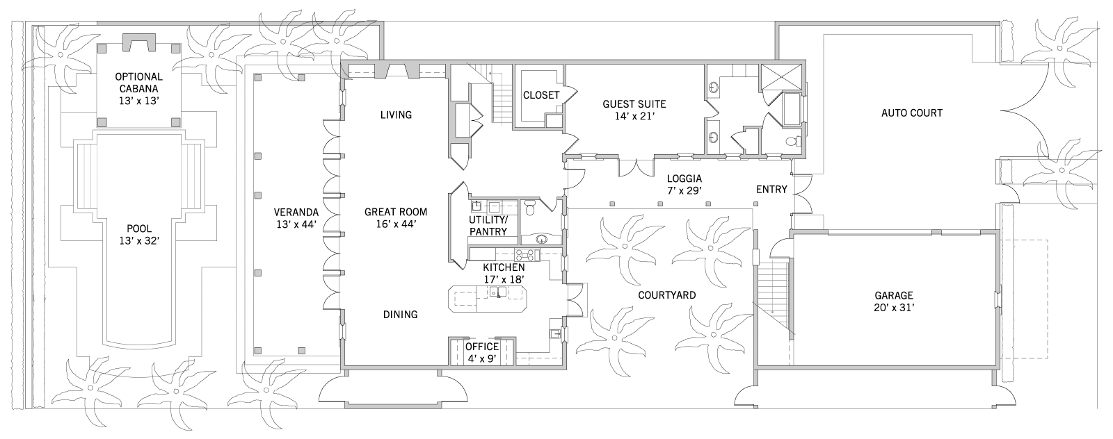 Entry to this home leads through a wide covered loggia to the main foyer with its immediate view of the pool courtyard.