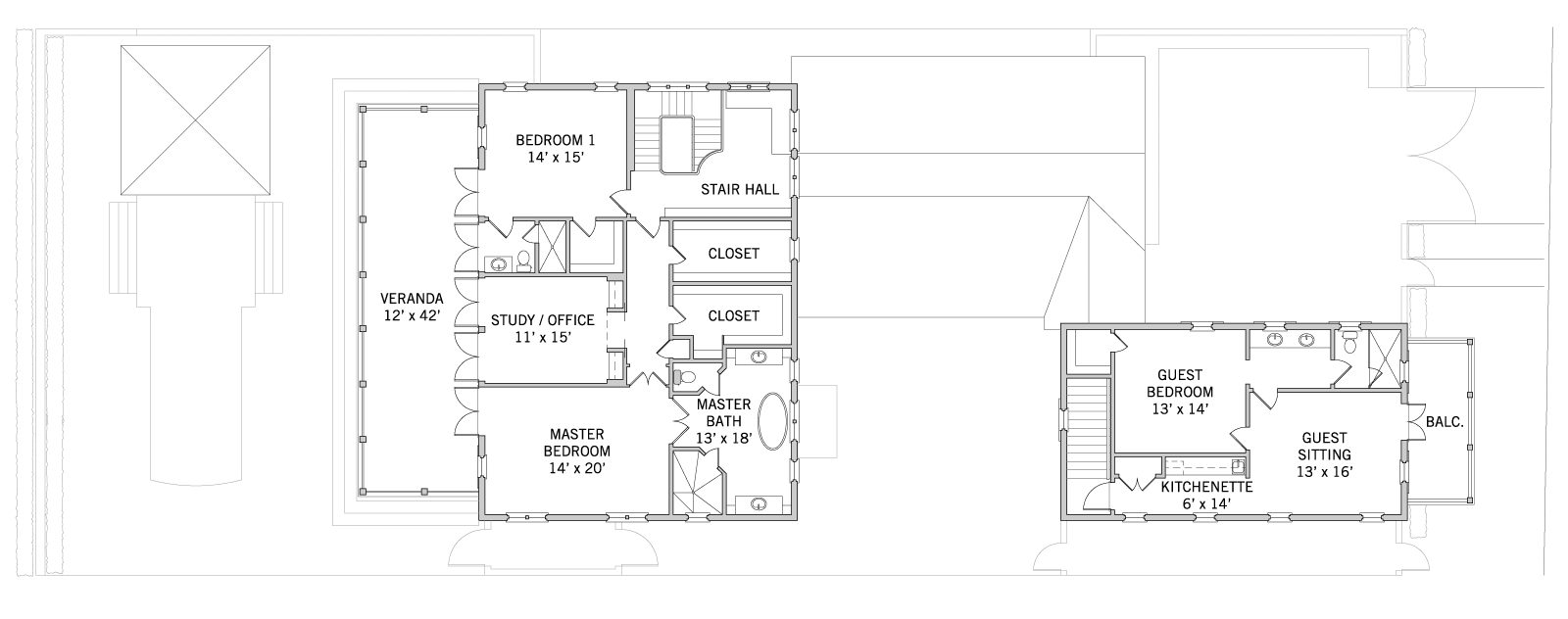 A great room spans the width of the home and features a series of French doors that open onto the pool and frame the lake and fairway views beyond. A well-appointed kitchen with a central island, large walk-in pantry and a home office space is conveniently tucked around a corner off the great room. The generously wide two-story veranda provides ample space for furniture, maximizing opportunities for outdoor living. Upstairs, the master suite boasts a luxurious bath, his and hers closets and a private study. A large bedroom suite on the ground floor can serve as a second master suite. The one-bedroom carriage house with kitchenette provides a private retreat for guests and completes this exceptional home design.